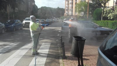 El Ayuntamiento de Cuenca ha estado actuando estos días de cara a la salida de menores a partir de este domingo 26 de abril. Así, a través de la empresa adjudicataria de limpieza FCC, y con el refuerzo de los efectivos de Geacam en algunos barrios, ha hecho batidas especiales desde el inicio de la semana desinfectando tanto las aceras de la ciudad con la baldeadora y el furgón hidrolimpiador como los llamados “puntos calientes”, como son papeleras, bancos, pulsadores de semáforos, barandillas, farolas… apoyados por mochilas pulverizadoras.