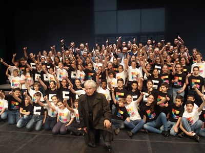 El broche de oro lo han puesto los 150 niños del Coro infantil del Conservatorio y Escolanía Ciudad de Cuenca que, vestidos con camisetas en las que aparecía el logo en diferentes combinaciones cromáticas, han interpretado los poemas del conquense Federico Muelas que previamente ha recitado Rafa Núñez. Acompañados por el piano de Mario Mora y bajo la dirección de Carlos Lozano, sus dulces voces han puesto de forma exitosa la música a los poemas Canción de la niña que lavaba, Villancico de los colegiales de San José y Las grajas en los cielos de las hoces.