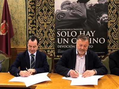 El alcalde de Cuenca, Darío Dolz, y el presidente de la Junta de Cofradías, Jorge Sánchez Albendea, han firmado el convenio de colaboración anual para el desarrollo de la Semana Santa 2023 por el que el Ayuntamiento aporta 60.000 euros para la organización de los desfiles procesionales.